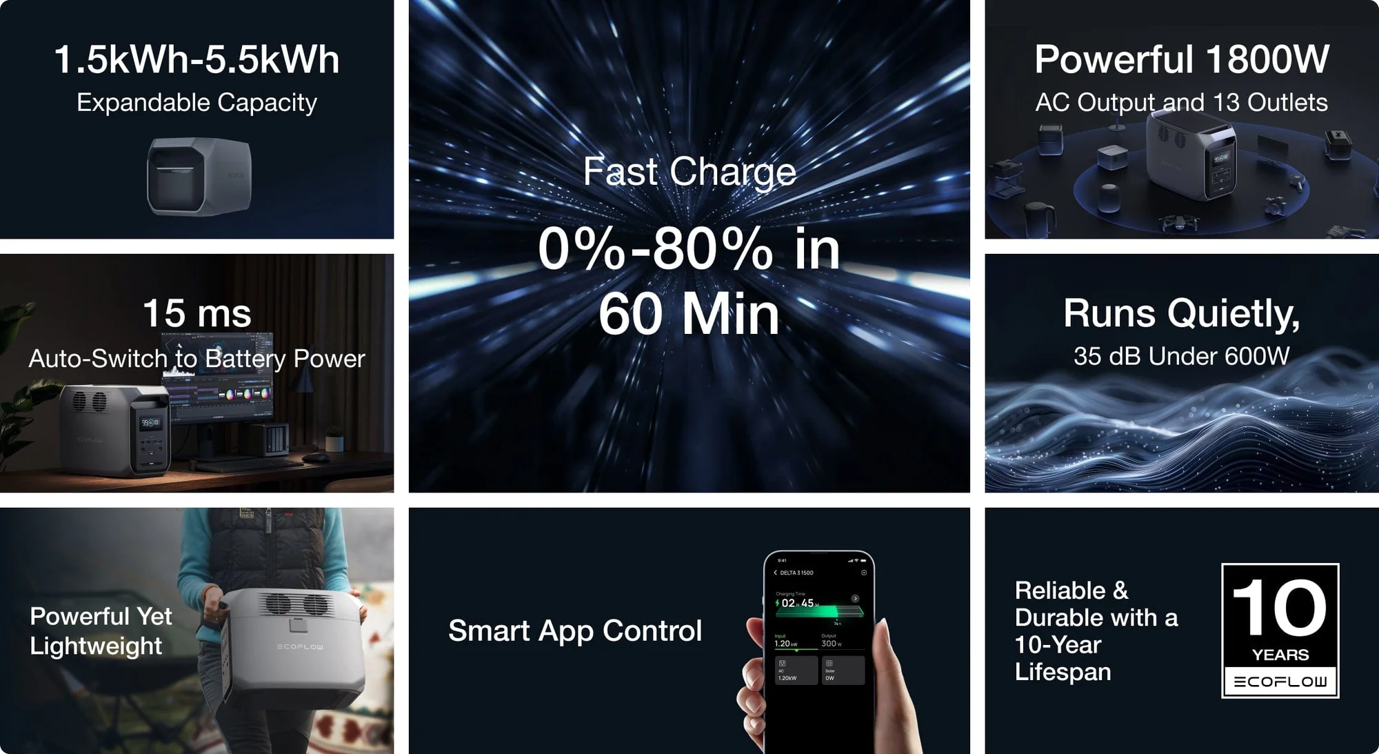 เปิดเครื่องได้เร็วกว่าพริบตา เมื่อใช้เป็นแหล่งพลังงานฉุกเฉินระหว่างไฟดับ DELTA 3 1500 จะทำงานโดยอัตโนมัติและให้พลังงานแก่คุณในเวลาน้อยกว่า 15 มิลลิวินาที