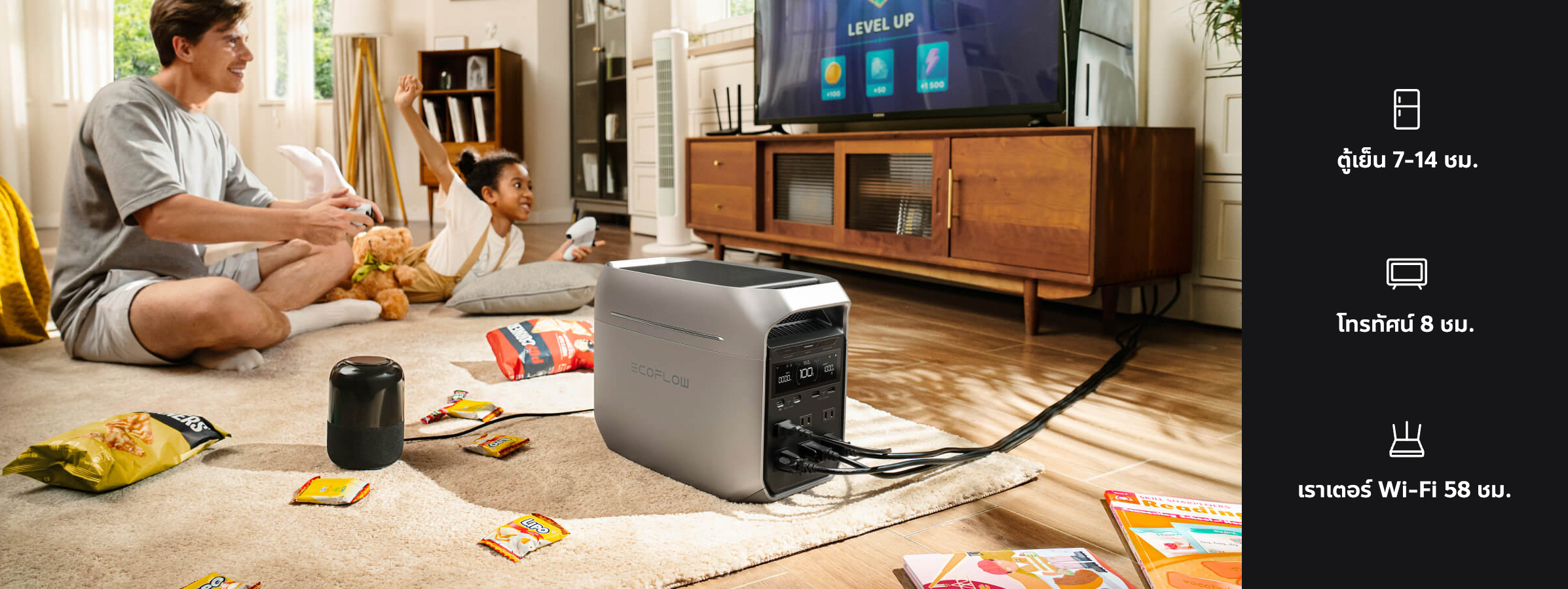 EcoFlow DELTA 3 Series รองรับอุปกรณ์ภายในบ้าน 99% รวมถึงตู้เย็น ทีวี และคอมพิวเตอร์ นอกจากนี้ ด้วยเทคโนโลยี EcoFlow X-Boost ยังจ่ายไฟให้กับเครื่องใช้ไฟฟ้าที่มีกำลังไฟมากกว่า 2,600 วัตต์ได้อย่างต่อเนื่อง เช่น เตาอบ (2,150 วัตต์) ไดร์เป่าผม (1,800-2,500 วัตต์) และกาต้มน้ำ (1,200-3,000 วัตต์) เหมาะอย่างยิ่งสำหรับการสำรองไฟในบ้าน รถบ้าน และการใช้งานกลางแจ้ง ตัวเครื่องทรงพลังนี้ช่วยให้คุณไม่ต้องอยู่ในความมืดอีกต่อไป